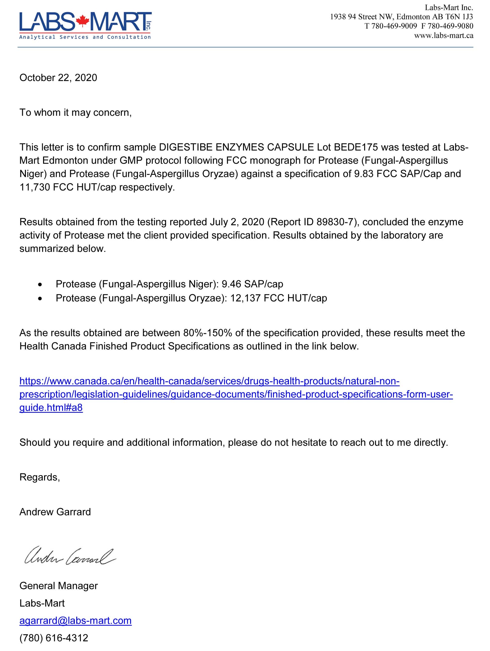 Alpha-galactosidase – Assists in the breakdown of certain vegetables (especially cruciferous vegetables) and legumes which may cause gastric discomfort or dietary intolerances for some individuals.